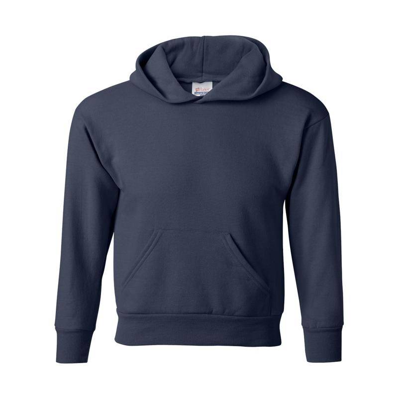 Hanes EcoSmart youth pullover hoodie made with up to 5% recycled polyester. Soft pill-resistant fleece in a kid-friendly fit — customize with your design.