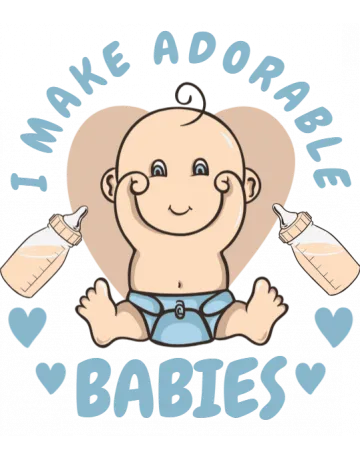 A cartoon baby with a heart-shaped head and a smile, surrounded by the words 'I MAKE ADORABLE BABIES' in a playful font.