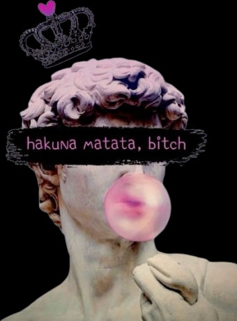 A statue with a crown and a pink heart, and the words "hakuna matata, bitch" written across its eyes.