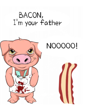 A cartoon pig with a speech bubble saying 'Bacon, I'm your father' and a strip of bacon with a speech bubble saying 'Noooo!
