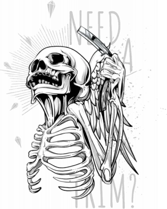 A skeleton with a knife and the words 'NEED A TRIM?'.