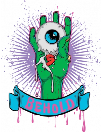 A green hand with an eyeball and dripping blood, holding a banner that says 'Behold'