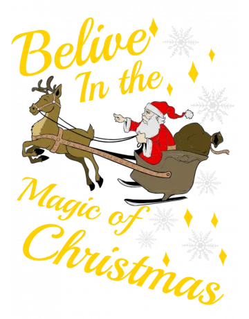 Santa Claus riding a reindeer with snowflakes and the phrase 'Believe In the Magic of Christmas' in yellow
