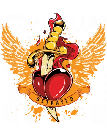 A red heart with a dagger through it, surrounded by wings and flames.