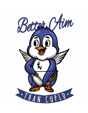 A cartoon penguin with a heart and the words 'I have better aim than cupid'