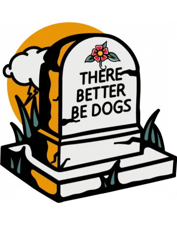 A tombstone with a dog and the words 'THERE BETTER BE DOGS' on it
