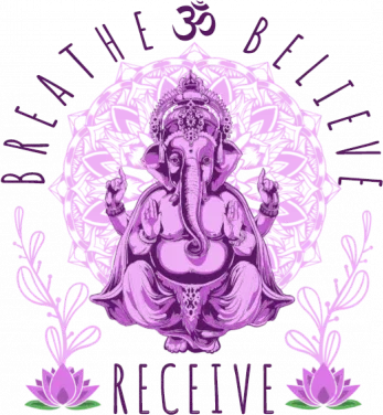 A pink elephant surrounded by a mandala and the words 'BREATHE BELIEVE RECEIVE' in a matching font.