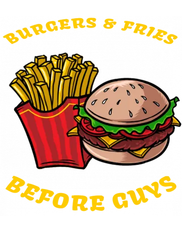 A cartoon illustration of a burger and fries with the text 'BURGERS & FRIES BEFORE GUYS' above and below it.