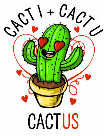 A cartoon cactus with a smiling face and heart eyes, surrounded by hearts and the word 'US'