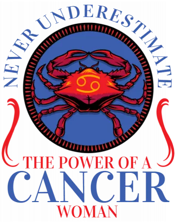 A red crab with a yellow symbol in the middle, surrounded by a blue circle and the words 'NEVER UNDERESTIMATE THE POWER OF A CANCER WOMAN' in blue and red text.