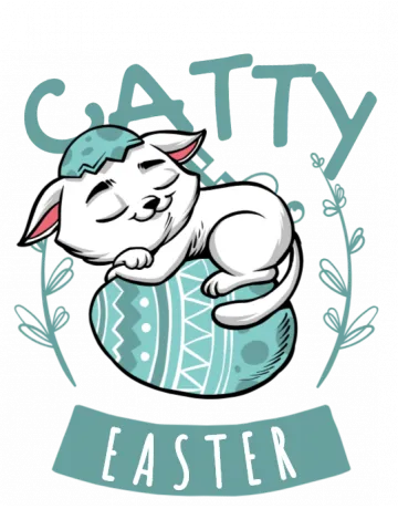 Cute cartoon cat sleeping on an Easter egg with the word 'CATTY' above it.