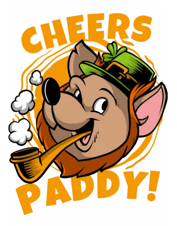 A cartoon mouse wearing a green hat and blowing on a pipe, with the words 'CHEERS PADDY!' written in yellow letters.