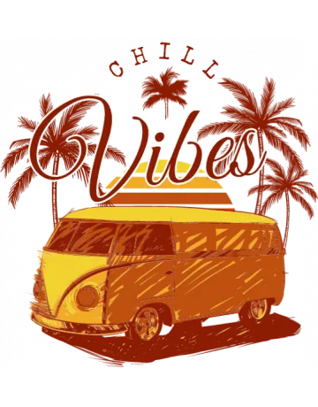 A vintage van with palm trees and the word 'Vibes' in cursive script