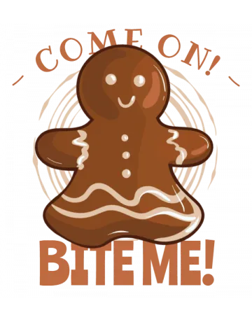 A gingerbread man with the phrase 'Come On, Bite Me!' in a playful font.