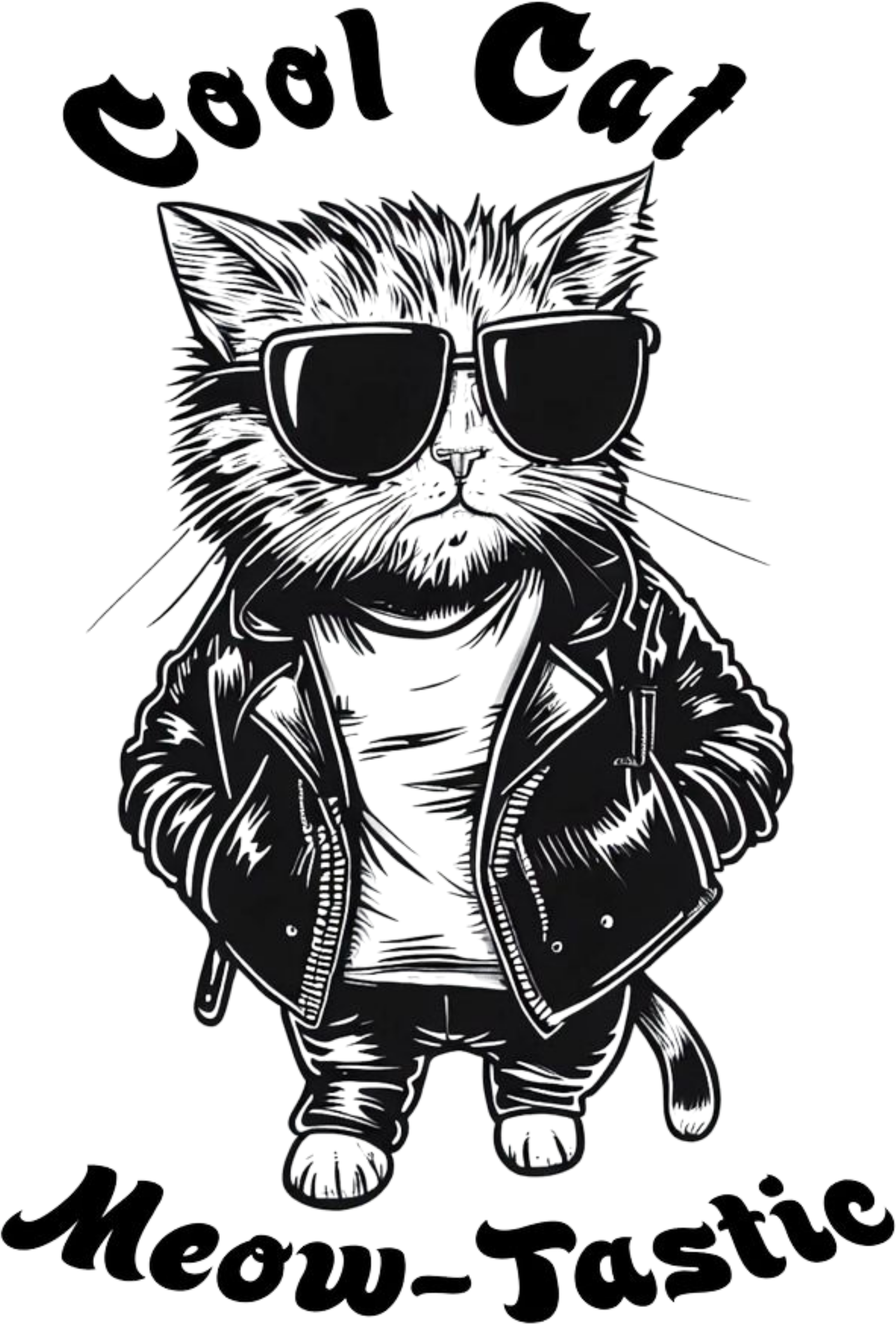 A cat wearing sunglasses and a jacket, with the text 'Cool Cat' written in a stylized font.