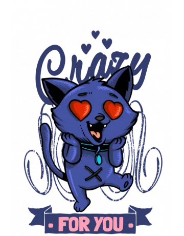 A cartoon cat with a collar and a heart-shaped eye, surrounded by the word 'Crazy' and a banner that says 'For You'.