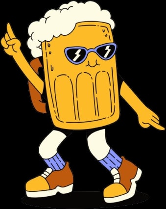 A cartoon beer mug with sunglasses and a foam head, giving a thumbs up.