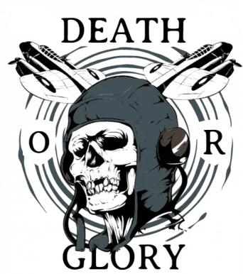 A skull wearing a beanie with a plane flying behind it, surrounded by the words 'DEATH OR GLORY' on a black background.