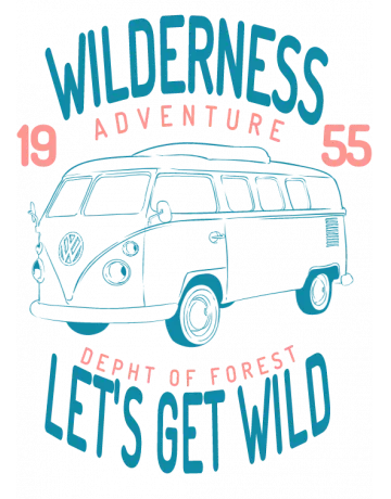 A vintage-style van with the words 'Wilderness Adventure' and 'Let's Get Wild' in blue and pink text.