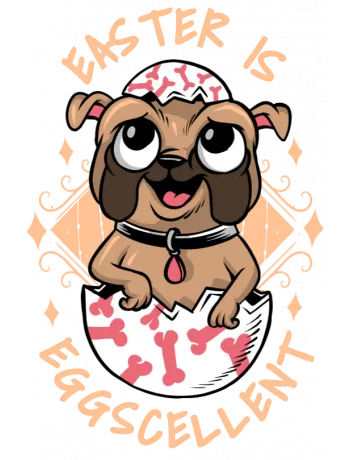 A cartoon dog with an eggshell body and bone-patterned shell, surrounded by the text 'EASTER IS EGGSCHELLENT' in a playful font.