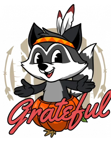 A cartoon raccoon wearing an orange headband and holding an orange with the word 'Grateful' in cursive script.