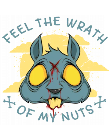A cartoon rat head with yellow eyes and blood dripping from its mouth, surrounded by the text 'FEEL THE WRATH OF MY NUTS' in a playful font.