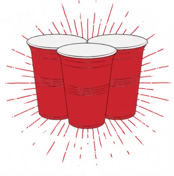 A graphic design featuring two red plastic cups with white interiors, surrounded by the words "FILL MY CUP" and "LET'S GET FUCKED UP" in white text.