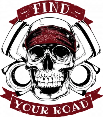 A skull wearing a bandana with a banner saying 'FIND YOUR ROAD' around it.