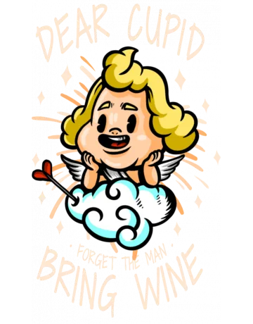 A cartoon Cupid with blonde hair and a mischievous grin, holding a wine glass and surrounded by sparkles and clouds.