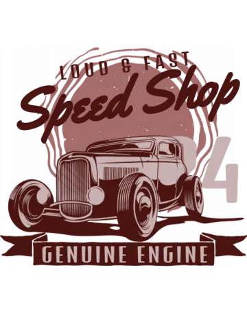 A vintage car with the words 'Speed Shop' and 'Genuine Engine' on a black background