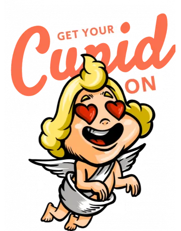 A cartoon cherub with blonde hair and white wings, surrounded by hearts and the phrase 'Get Your Cupid On' in orange and white text.
