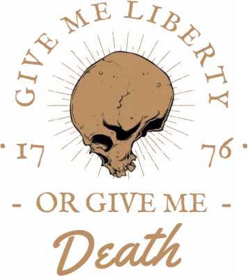 A skull with rays and text saying 'Give me liberty or give me death'