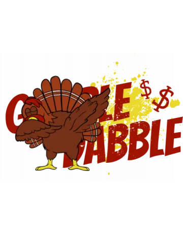 A cartoon turkey with the words 'Gobble Wobble' in red and yellow text.