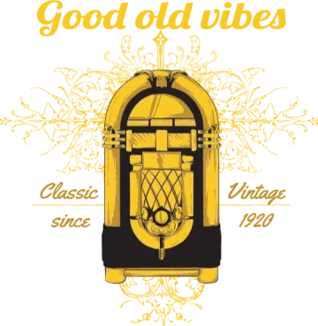 A yellow and black design featuring a vintage-style jukebox with the words 'Good old vibes' and 'Classic since 1920' written in a vintage font.