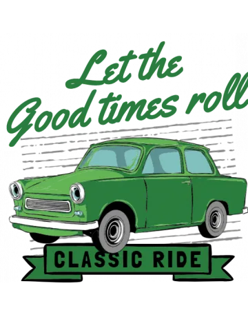 A green vintage car with the words 'Let the good times roll' in green cursive script.
