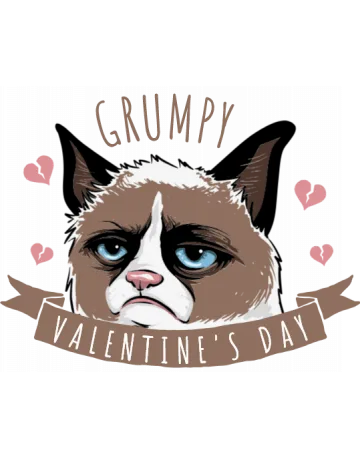 A cartoon cat with a grumpy expression, surrounded by hearts and a banner with the text 'Valentine's Day'.