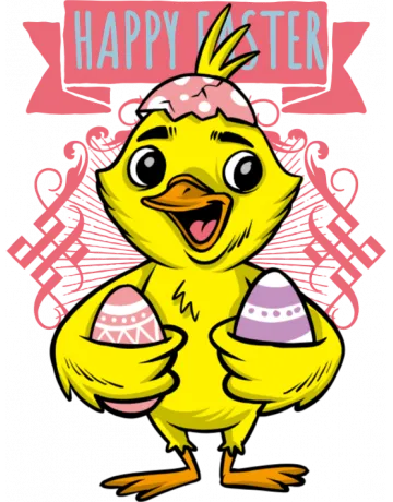 A cartoon chick holding an Easter egg with a pink banner that says 'HAPPY EASTER'