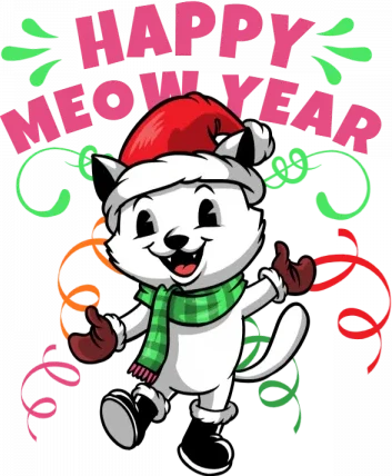 A cartoon cat in a Santa hat and scarf with the words 'Happy Meow Year' above it.
