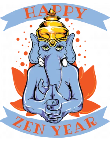 An elephant with a gold headdress and a banner that says 'Happy Zen Year' in orange text.