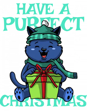 A cartoon cat holding a gift with the words 'Have a purrfect Christmas' above it.