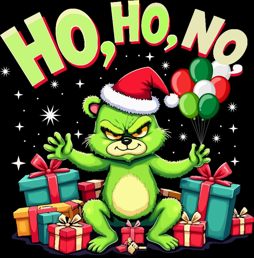 A cartoon cat with a grumpy expression, wearing a Santa hat and surrounded by presents and balloons, with the text 'HO, HO, NO' in green and red letters.