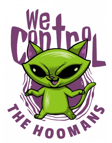 A cartoon green cat with the words 'We Control the Hoomans' in purple
