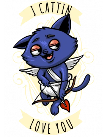 A cartoon cat with a bow and arrow, surrounded by a banner with the words 'I CATTIN LOVE YOU'.