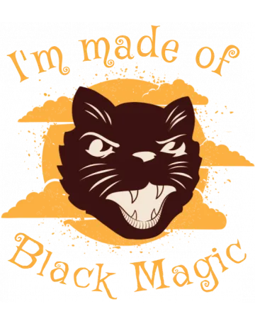 A black cat's head with an evil grin and the words 'I'm made of Black Magic' in yellow text.