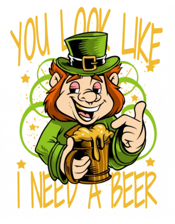 A cartoon leprechaun holding a beer mug with the text 'You look like I need a beer'