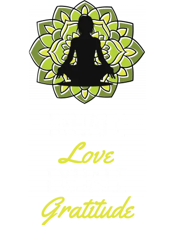 A silhouette of a person meditating in front of a green lotus flower, with the words 'INHALE Love EXHALE Gratitude' written below.