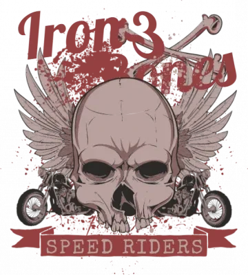 A skull with wings and a motorcycle, with the words 'Iron 3 Speed Riders' in red