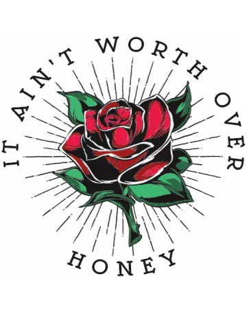 A rose with the phrase 'It ain't worth over honey' in a vintage style