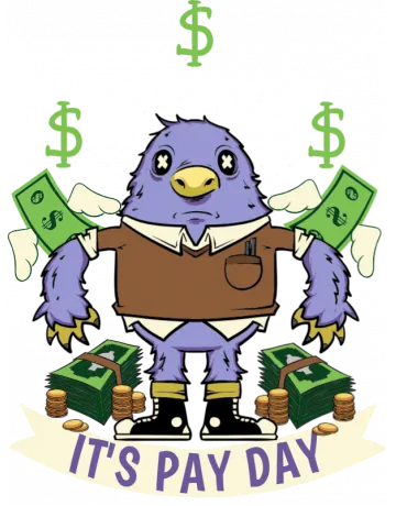 A cartoon bird with money and the phrase 'It's Pay Day'