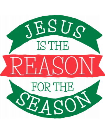 A simple design featuring a red banner with the words 'Jesus is the reason for the season' in white text, surrounded by green ribbons.